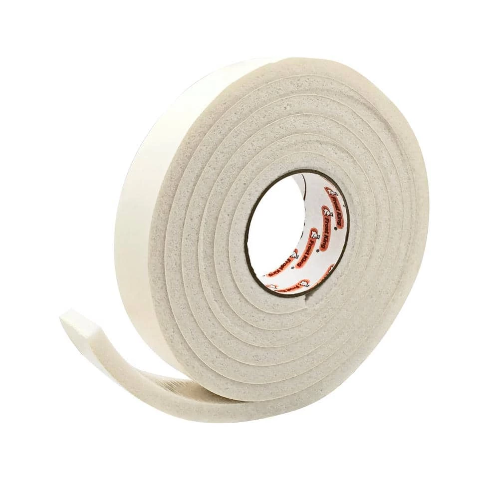 The Thermwell Products Co. Inc. 1-1/4 in. x 5/16 in. x 10 ft. White High-Density Rubber Foam Weatherstrip Tape is a self-adhering weather stripping designed for both indoor and outdoor use and is waterproof for added durability.