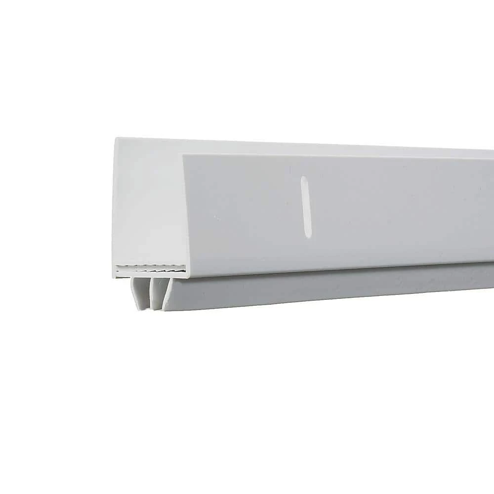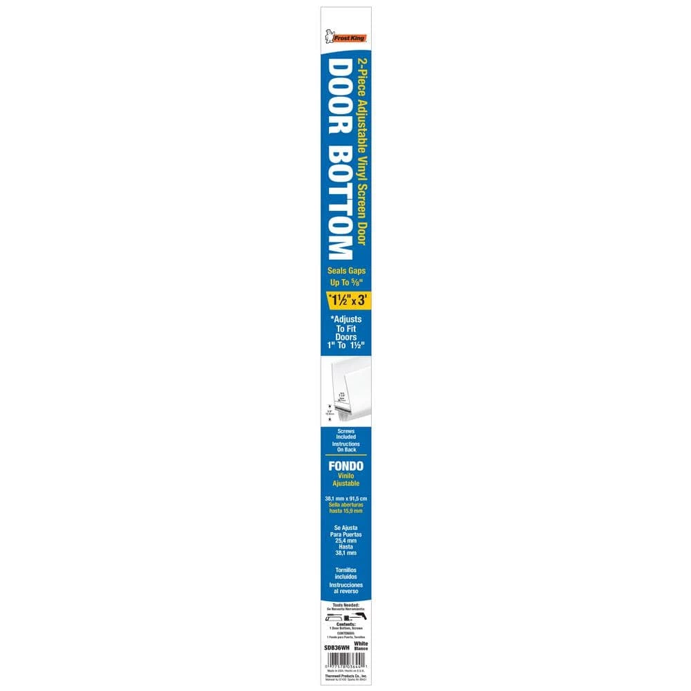 This 1 – 1-1/2 in. x 36 in. Adjustable Storm Door Bottom is a 2-piece PVC unit that snaps together to securely fit the bottom of a storm door. The door strip has angled bottom fins to seal out drafts and dirt. It improves the closure of air-cushioned doors. The Door Bottom also helps keep out bugs and cold air.