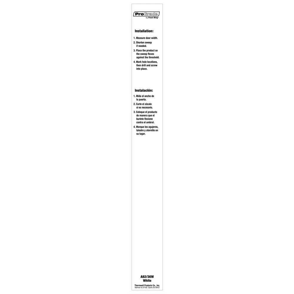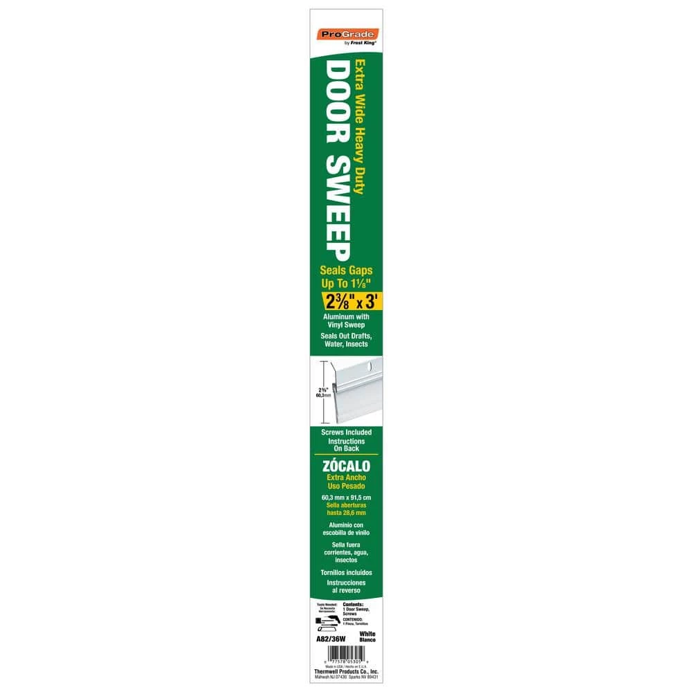 Seal out cold, dust, bugs and moisture with the Thermwell Products 2-3/8 in. x 36 in. White Wide Door Sweep. The door sweep is made from extruded aluminum and heavy-duty vinyl for long-lasting performance and can seal up to 1-1/4 in. gaps. Slotted screw holes make this door sweep adjustable to create a snug fit.