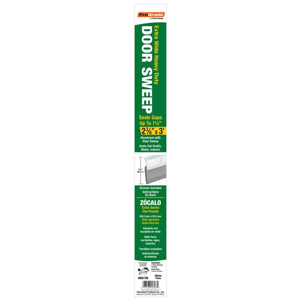 The 2-3/8 in. x 36 in. Heavy-Duty Door Sweep helps seal out dirt, dust, bugs and the cold. The door sweep features heavy-duty aluminum construction for durability and an attractive silver-metallic finish. The 2-3/8 in. wide sweep will seal gaps up to 1-1/4 in. to help save energy and money.