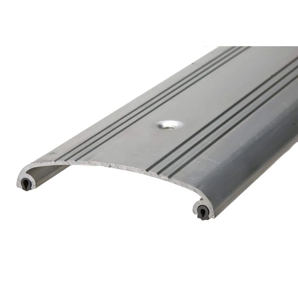 The 3-1/2 in. x 36 in. Silver Smooth-Top Saddle Threshold for Low Rugs is durable under heavy traffic and works in conjunction with door shoes (not included). The threshold is constructed of metal and vinyl.