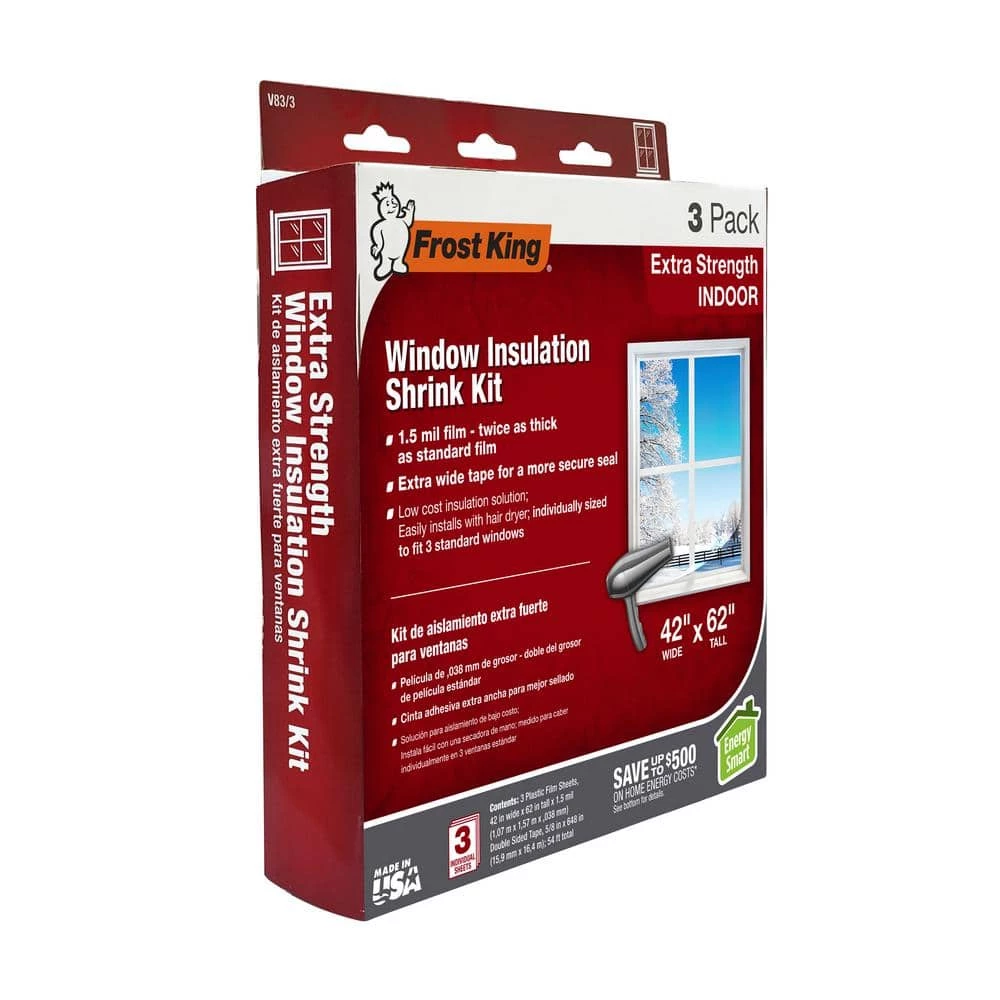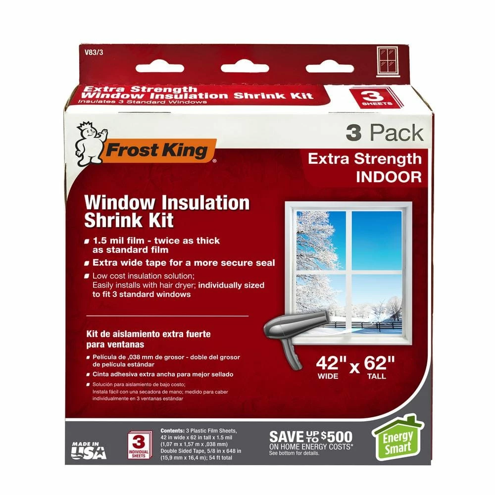 This E/O Shrink Window Insulation Kit 3-Pack is Heavy Duty. It is twice as strong as our standard shrink kit. For situations where toughness and extra strength are important, this Window Kit will stand up to the challenge. Shrinks clear and tight with a regular hairdryer.