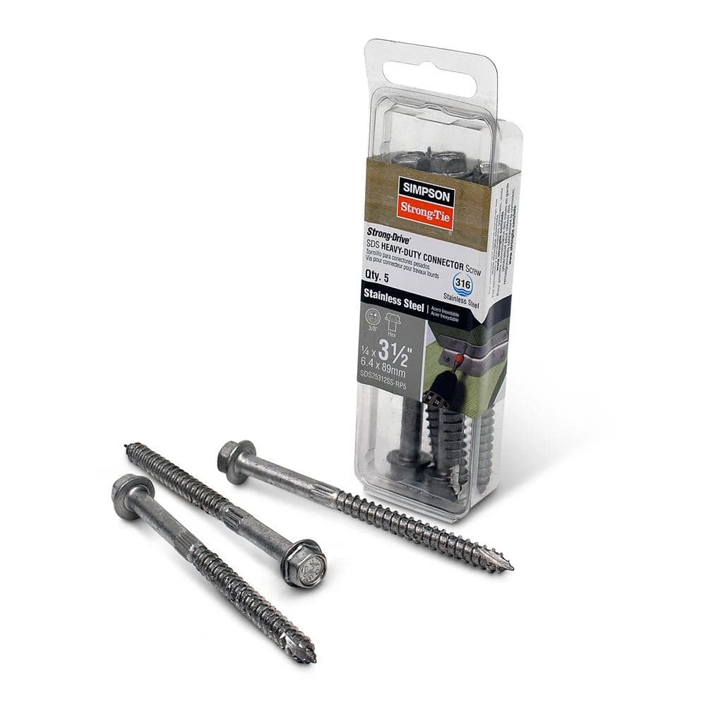 The Simpson Strong-Tie Strong-Drive SDS Heavy-Duty Connector screw is a 1/4-in-diameter high-strength structural screw ideal for various connector installations as well as wood-to-wood and engineered wood applications. It installs with no predrilling and has been extensively tested in various applications. The SDS Strong-Drive 1/4-in wood screw line includes stainless-steel screws in 1-1/2-in to 3-1/2-in lengths, suitable for fastening Simpson Strong-Tie stainless-steel products. Offering the same easy-driving, split-reducing installation of the standard SDS screw, these screws are made from Type 316 stainless steel. Stainless-steel SDS screws are appropriate for higher-exposure environments where maximum corrosion-resistance is required.
