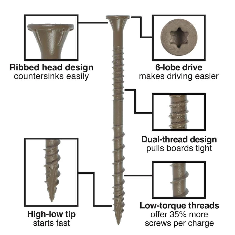 The Deck-Drive DSV Wood screw is a powerful fastening solution for preservative-treated decking applications. With its underhead nibs and fast-start tip, the DSV is ideally suited to be driven and countersunk into todays wood deck boards. The shank is designed to withstand the swelling and shrinkage that is common with fast-growth lumber. DSV screws are also offered in a variety of sizes to fasten fascia and trim.