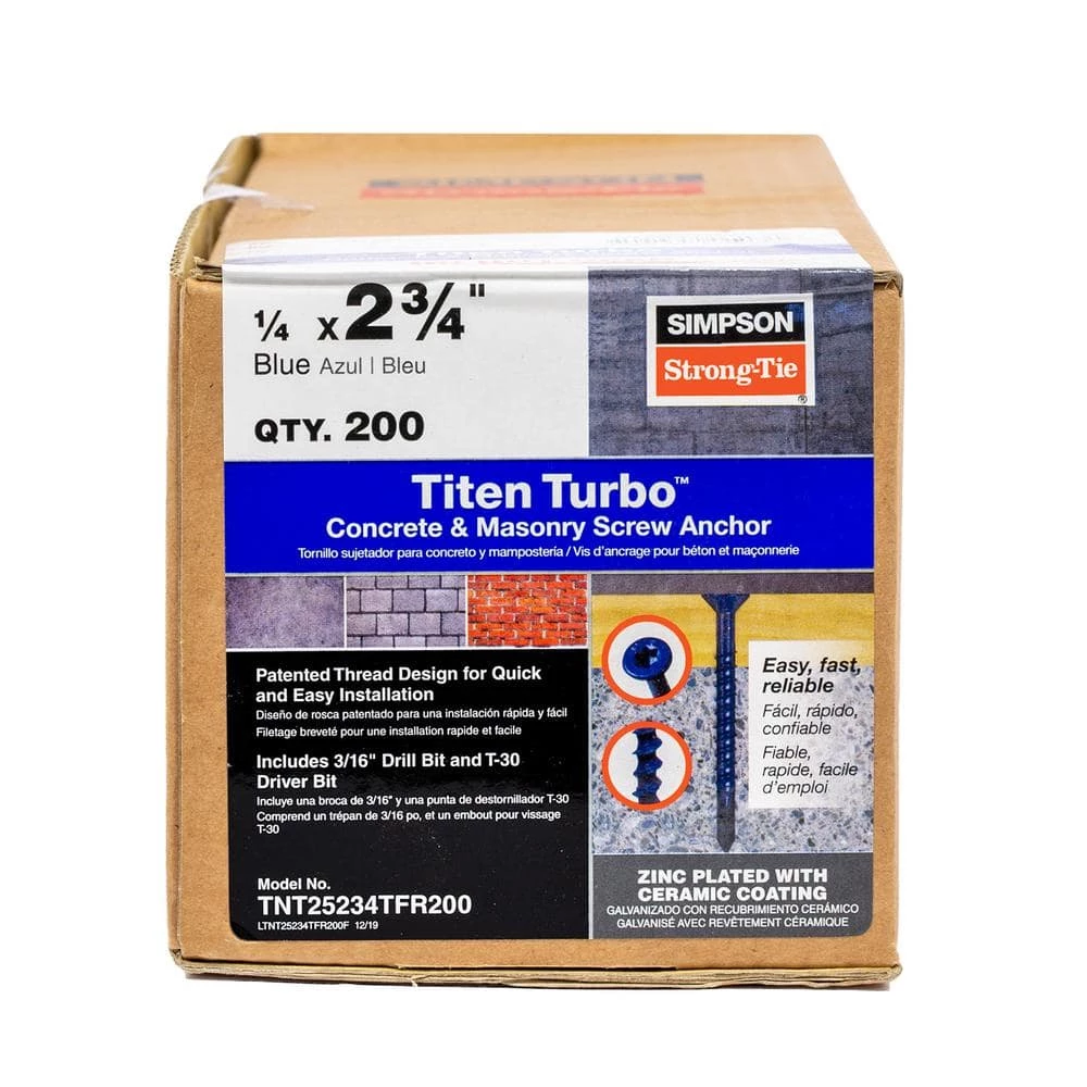 The Titen Turbo screw anchor is fast and easy to install and incredibly reliable in its performance. The secret behind the performance of the Titen Turbo lies in a thread design that lowers driving torque while providing superior holding power. The revolutionary Torque Reduction Channel between the threads gives drilling dust a place to go, thereby significantly reducing torque-related issues like binding, stripping and snapping. This screw anchor delivers consistently trouble-free installation and fastening strength you can depend on.