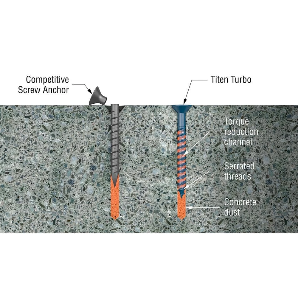 The Titen Turbo screw anchor is fast and easy to install and incredibly reliable in its performance. The secret behind the performance of the Titen Turbo lies in a thread design that lowers driving torque while providing superior holding power. The revolutionary Torque Reduction Channel between the threads gives drilling dust a place to go, thereby significantly reducing torque-related issues like binding, stripping and snapping. This screw anchor delivers consistently trouble-free installation and fastening strength you can depend on.